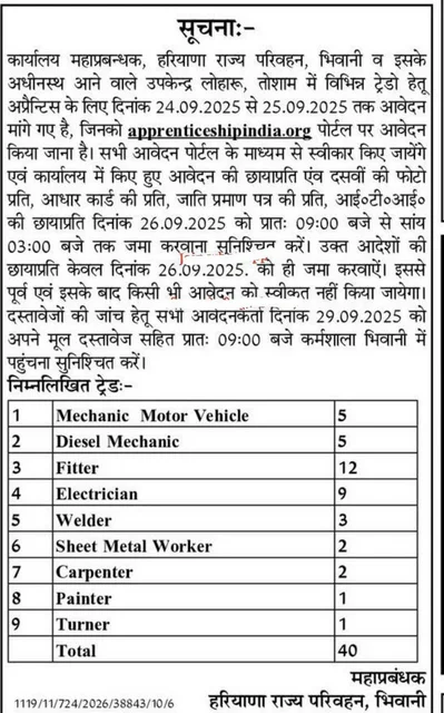 Haryana Roadways is recruiting apprentices across multiple trades to enhance technical skills and on-the-job learning. Candidates will get practical exposure while working in a government-operated transport organization. Each post has a limited number of vacancies, making timely application crucial.