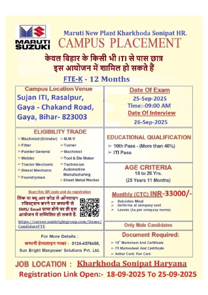 The placement drive will be held on 25th & 26th September 2025 at Sujan ITI, Rasalpur, Gaya, Bihar.